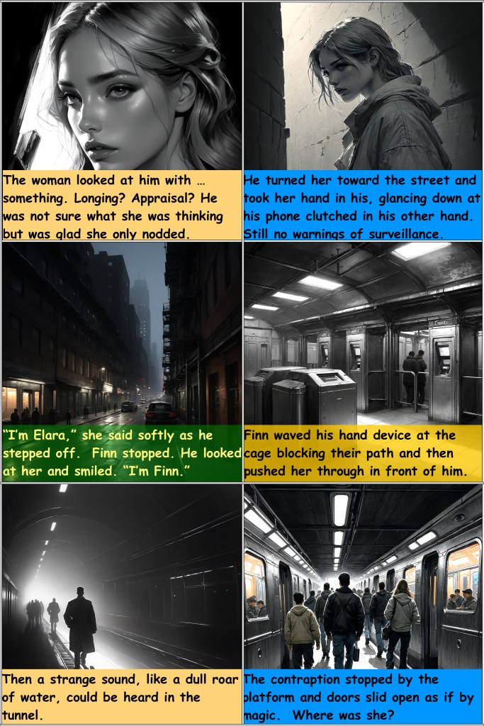 “Okay,” he said. “We’re going out to the street and to the left. The subway is only a half block away. Hold on to my hand so we don’t get separated.” She nodded and took his hand. “I’m Elara,” she said softly as he stepped off. Finn stopped. He looked at her and smiled. “I’m…