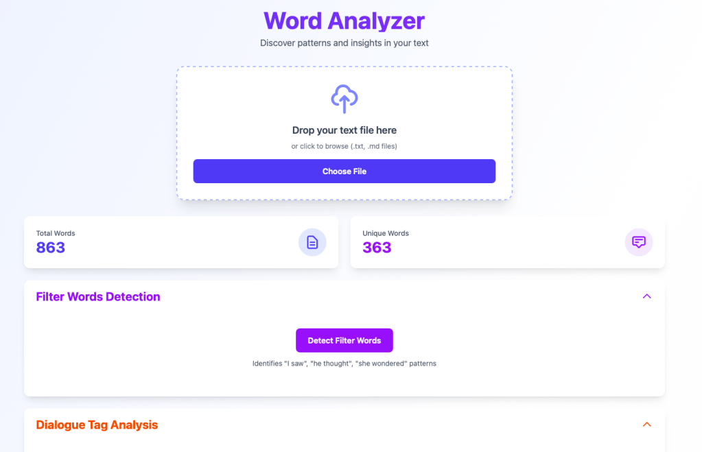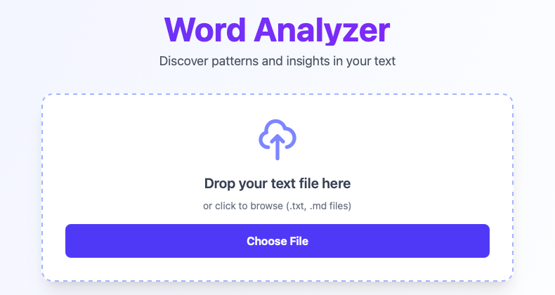 The main UI is straight forward, upload or drop a text file on the service and the analysis runs:
