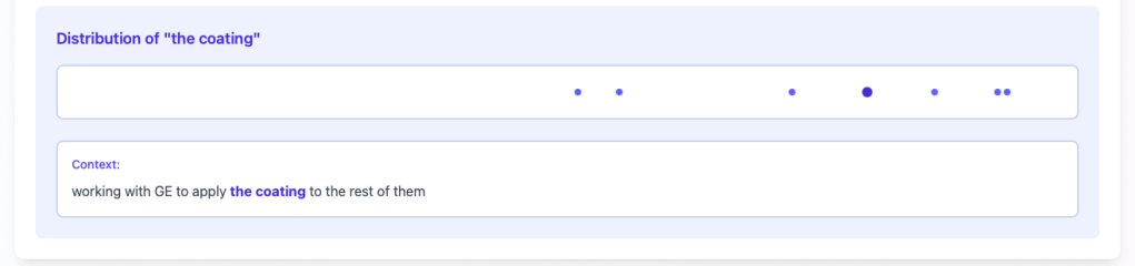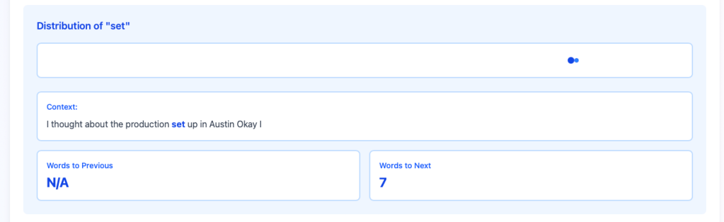 In this example, by setting the min gap to 15 words or less, and looking at the word “set”, I can see it’s used twice in close proximity. Clicking on the dot in the distribution view, I can see the context of the word within the document: