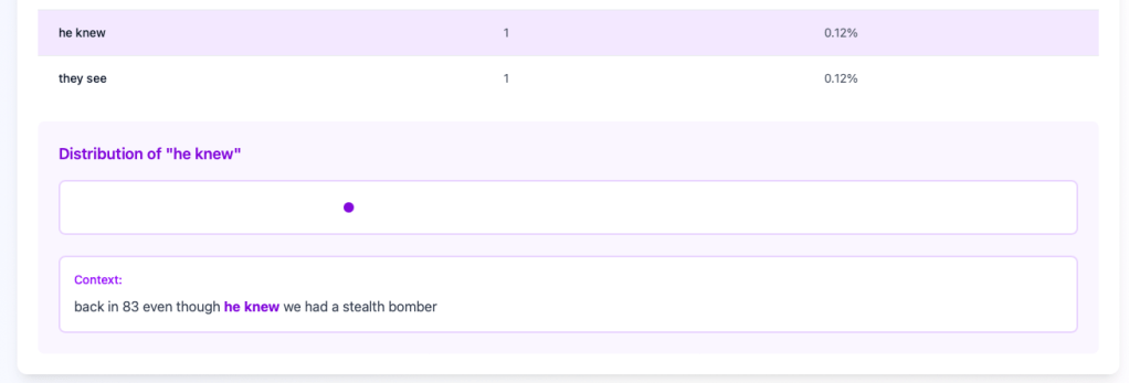 The pattern repeats, and clicking on the phrase will show the distribution of usage and let me drill into the context: