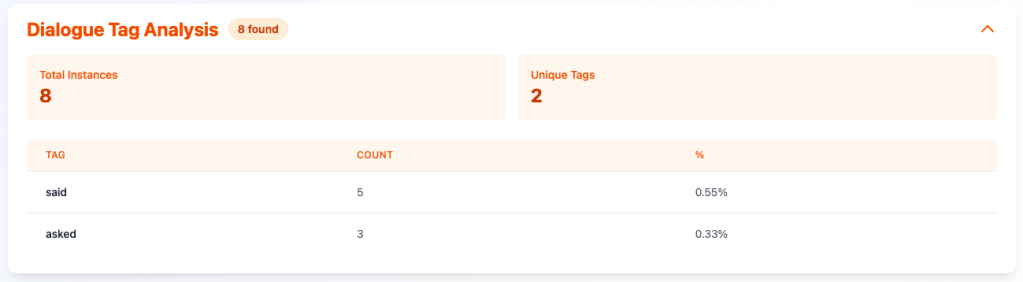 I can quickly see if I’m over-using “said” or similar dialog tags, which I am in this example. The same patter of clicking on the tag will reveal the distribution within the document, and clicking on the instance on the timeline will show the context of the usage: