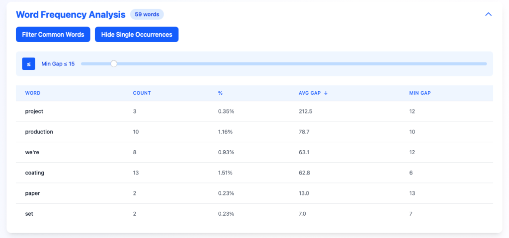 This was the first feature I built in the tool. It gives me the ability to see distribution of words in the file and filter out common words or words that only appear once. Using the “Min Gap” filter lets me search for repeated words that occur in close proximity to one another so I can change the word as appropriate for the narrative.